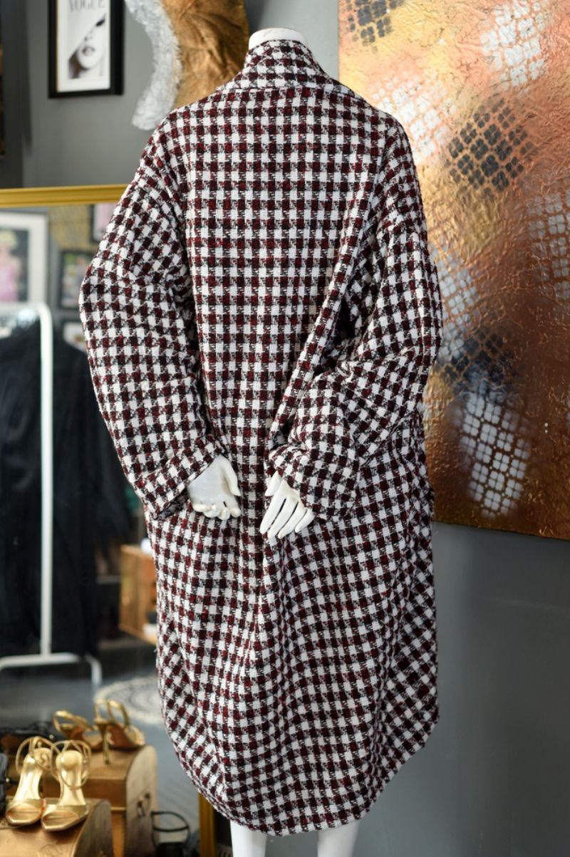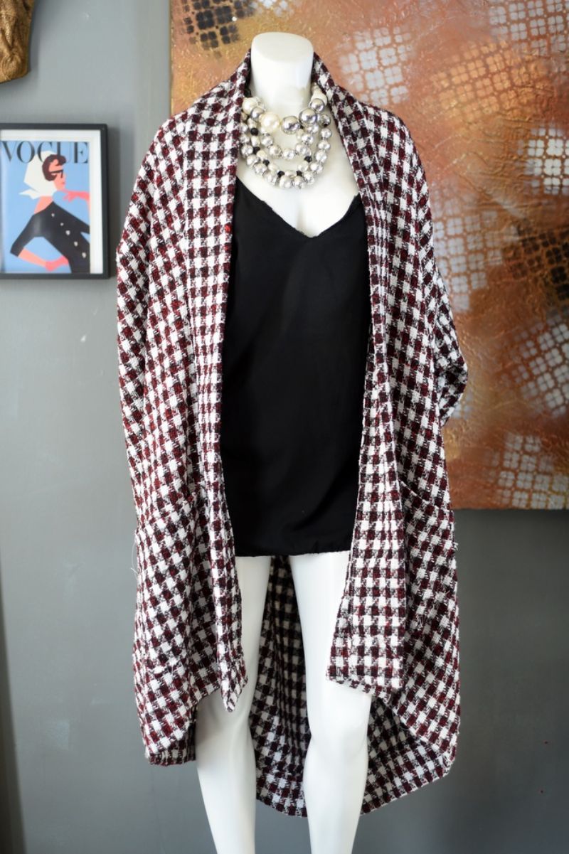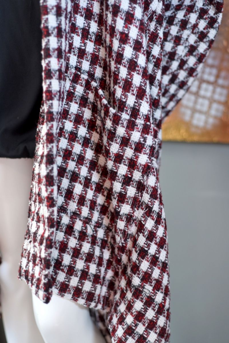 a red, black & white plaid oversized jacket in a cotton woven boucle fabric. A cocoon silhouette with an asymmetrical high - low hemline. A slouchy fit. Midi Length.