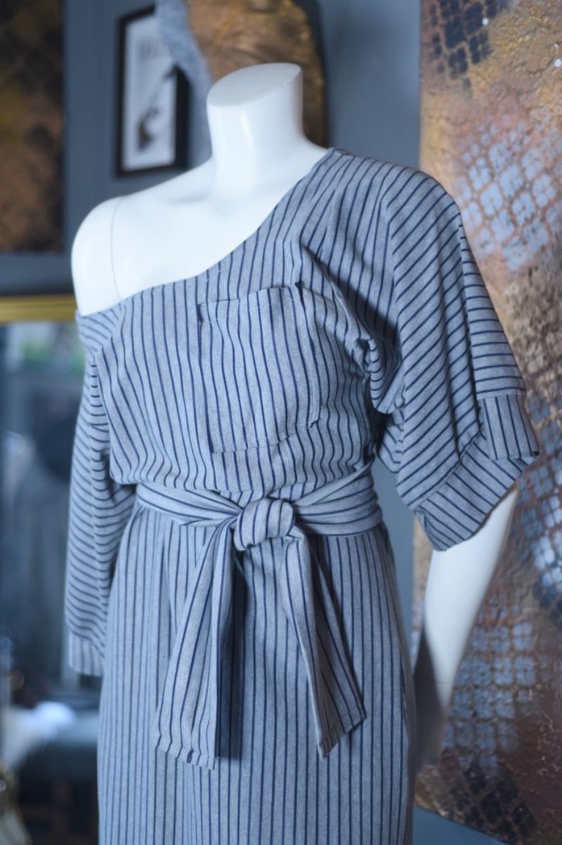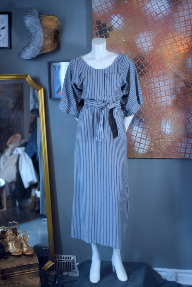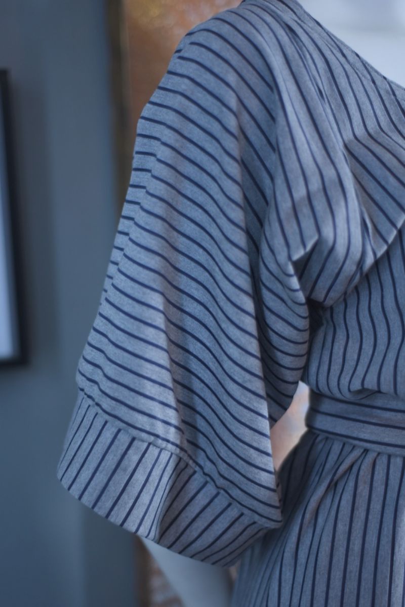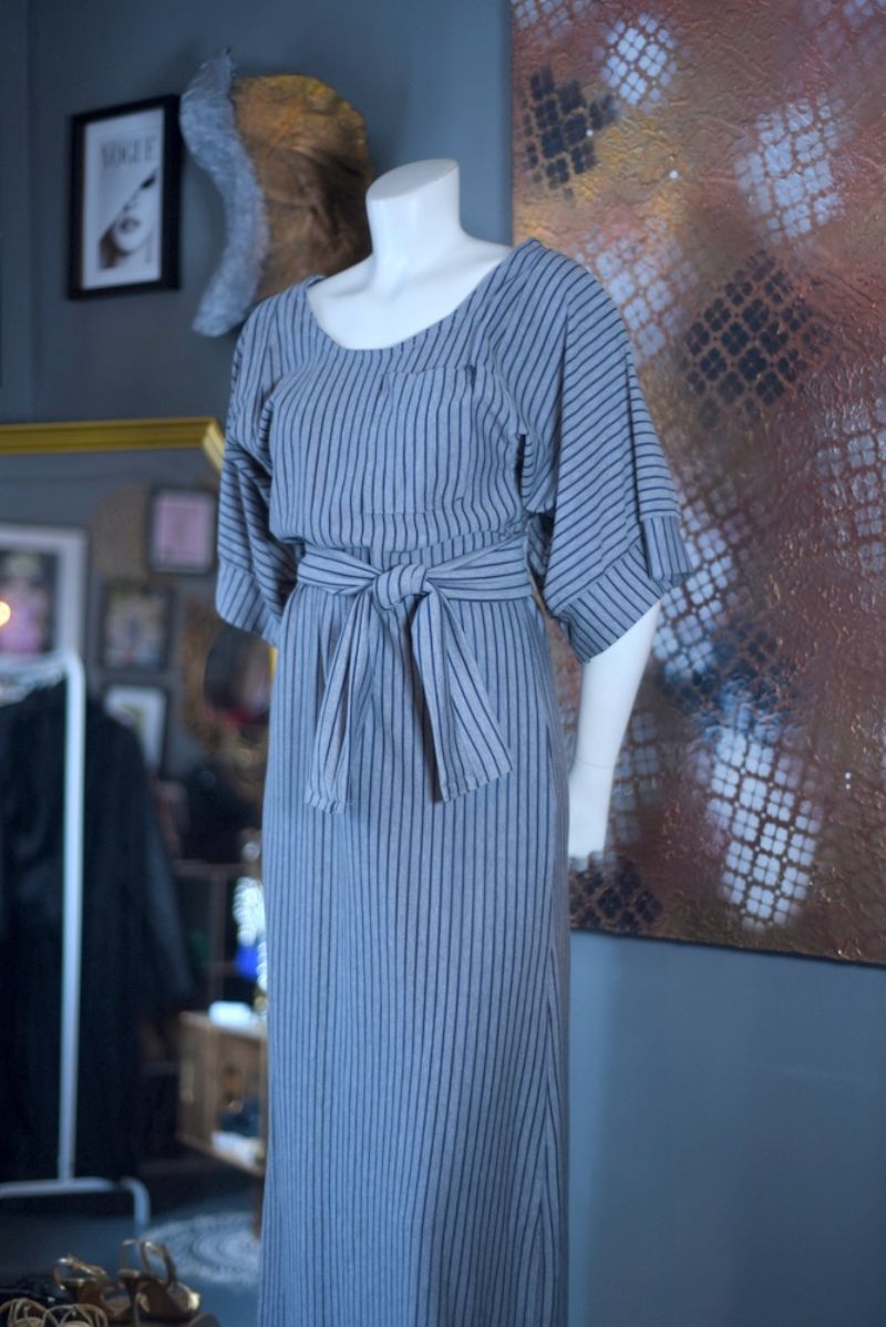Boat neck A-Line silhouette maxi dress with a grey and navy striped pattern. The sleeves are 3.4 length and kimono styled. Comes with a matching tonal belt.
