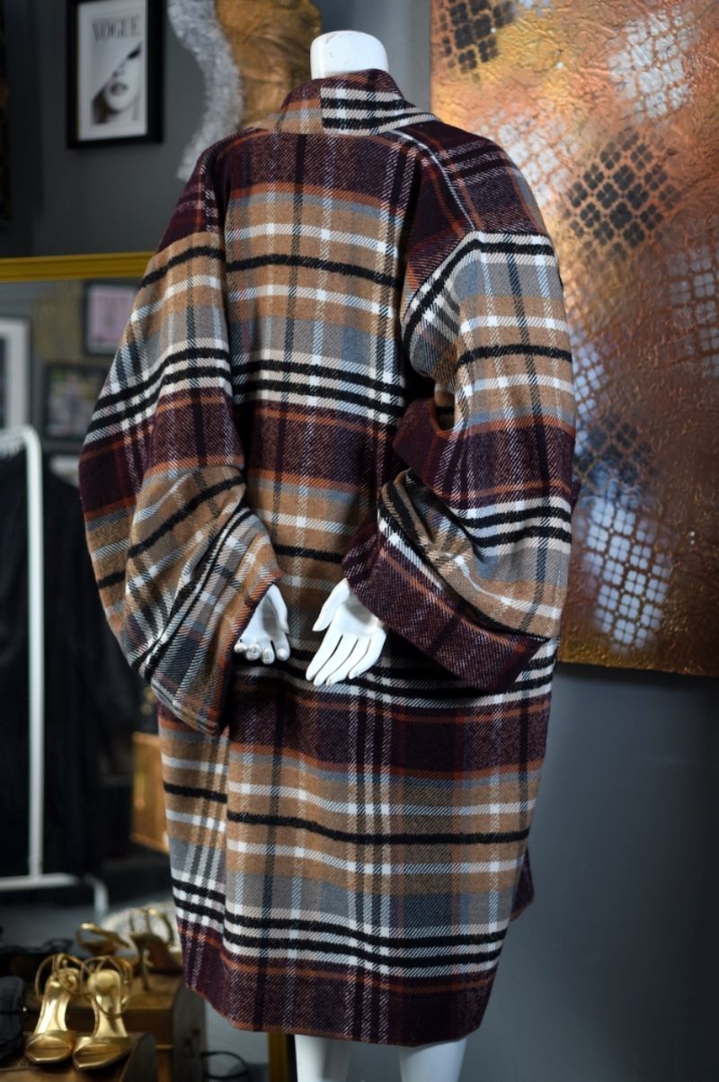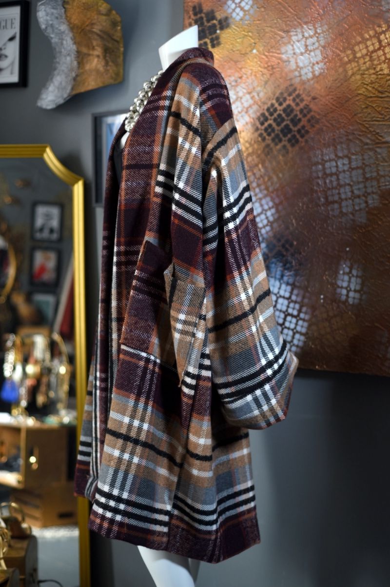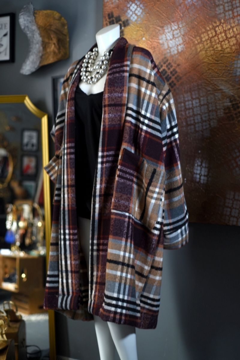 A black, tan, burgundy, grey and burnt orange tartan pattern in a wood / cotton woven blend. It is a Robe Styled Coat with extra wide and long kimono styled cuffed sleeves. This unique jacket has a lapelless collar and 2 extra large front pockets.